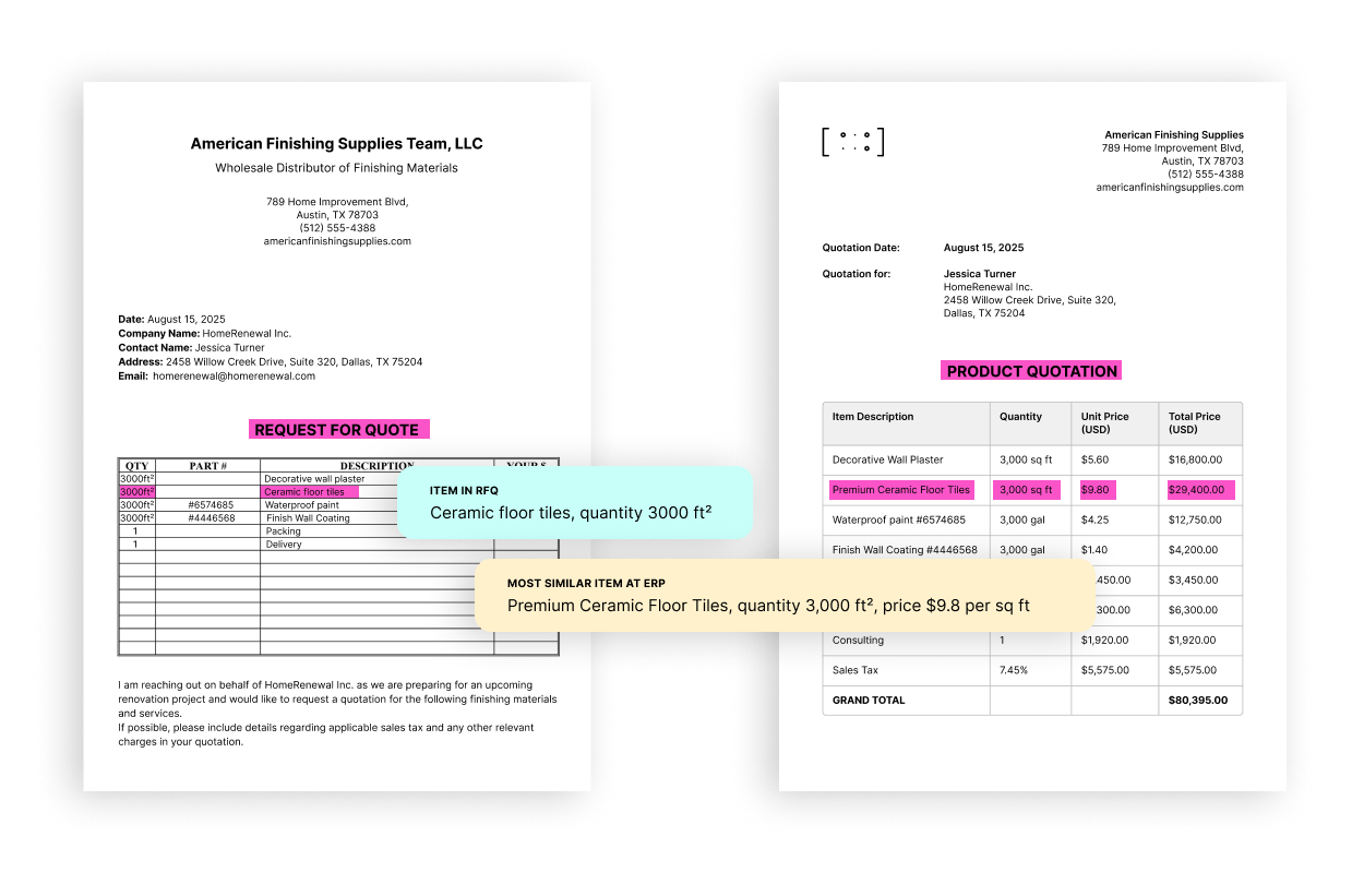 The demo automatically pulls relevant pricing information for each matched product from your previous quotations, purchase orders, or historical ERP data.