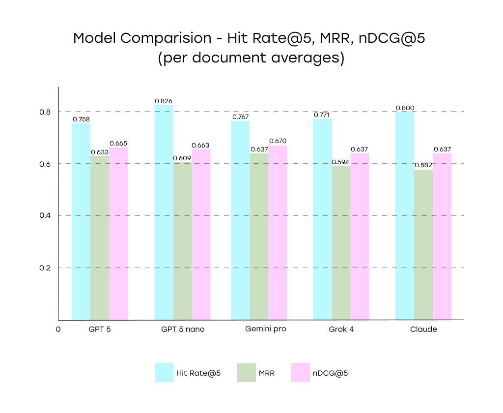 - GPT-5 Nano offers top-tier recall at a fraction of the cost of larger models.