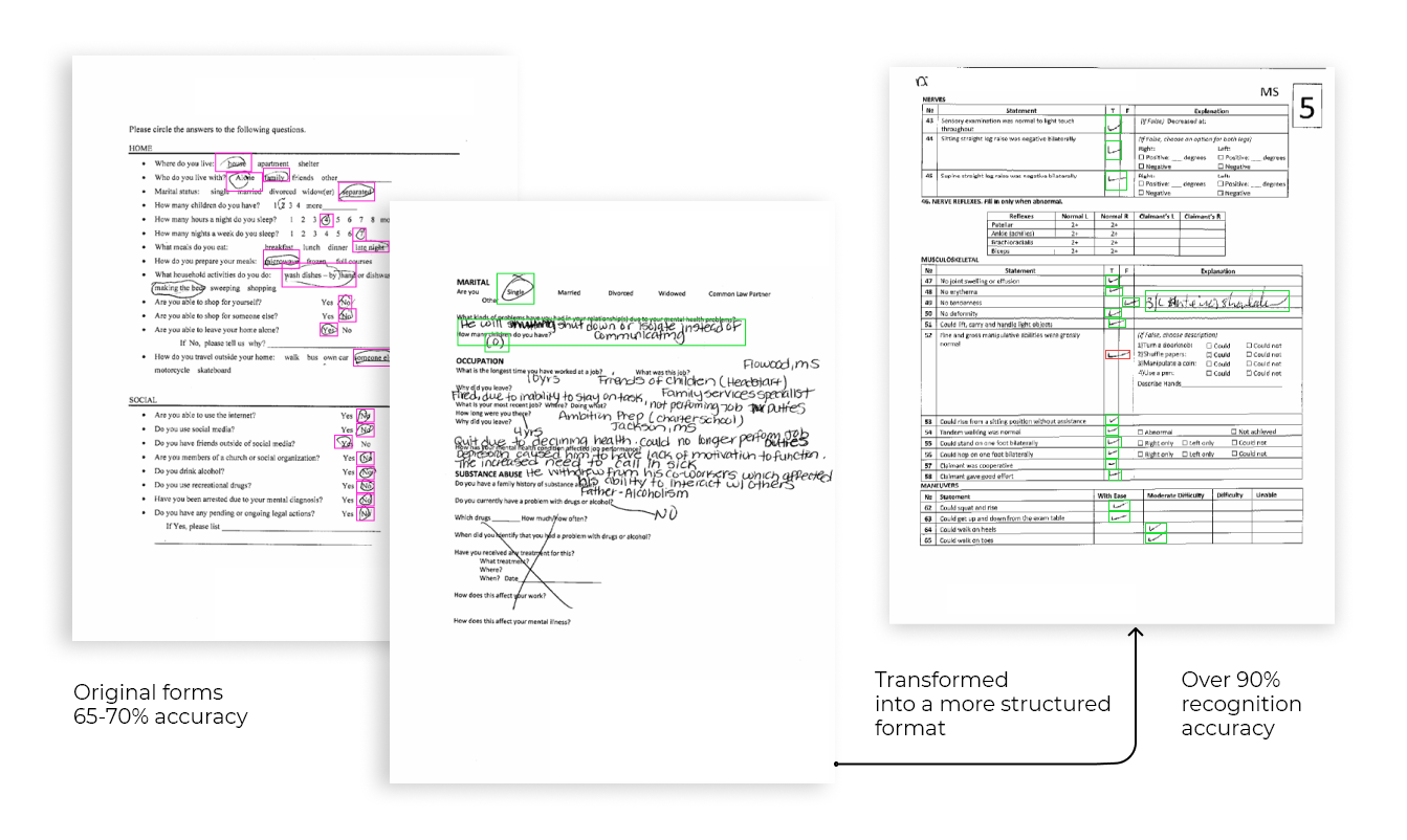At the start of the project, the team redesigned the forms to make them as structured and standardized as possible. Initially, there were many forms with large handwritten response sections for patients, and answer options were often circled, which made parsing extremely difficult.