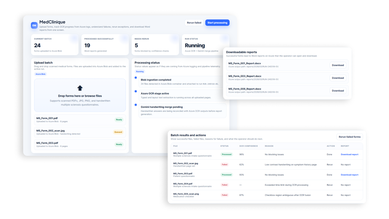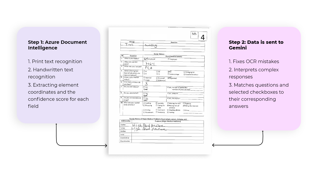The goal of the project was to convert handwritten and printed forms into a structured digital format so that doctors could quickly find and analyze patient information.