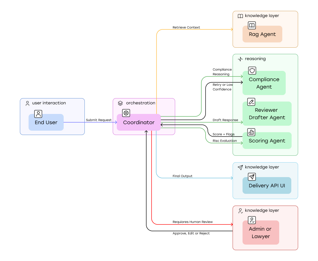 A central orchestration layer manages workflow execution, ensuring that outputs are consistent, structured, and aligned with business rules. This modular design allows the system to scale and adapt to different use cases without compromising control or transparency.