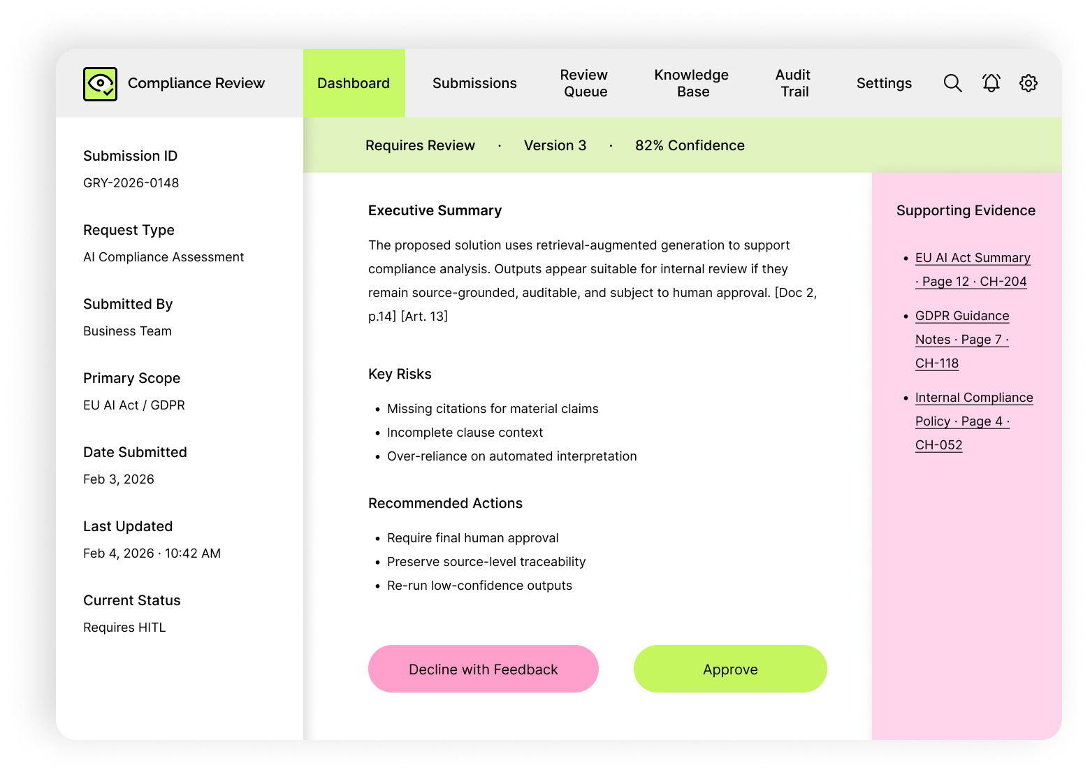 Given the critical nature of compliance decisions, the system incorporates a human-in-the-loop review process. When necessary, AI-generated outputs are routed to experts for validation. Reviewers can approve results or provide structured feedback, which the system uses to refine subsequent iterations. All actions are logged, creating a complete audit trail for every decision.